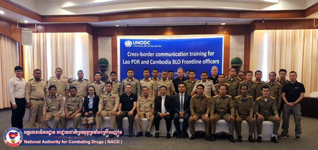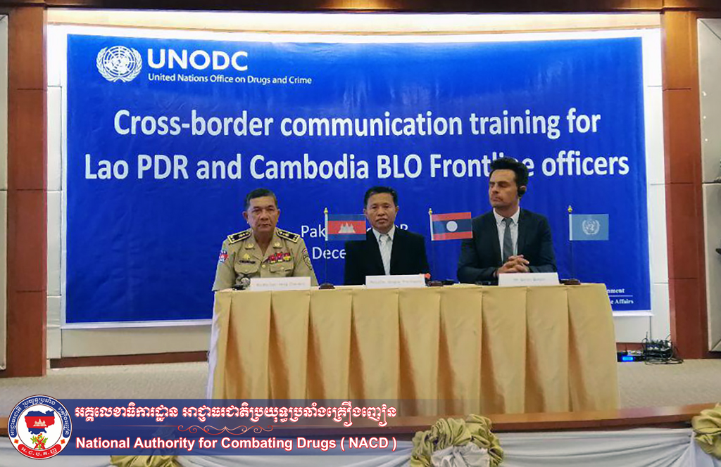 ខេត្តចំប៉ាសាក់ ប្រទេសឡាវ ព្រឹកថ្ងៃទី៣ ខែធ្នូ ឆ្នាំ២០១៨ ពីធីបើកវគ្គបណ្តុះបណ្តាលសម្រាប់មន្ត្រីការិយាល័យទំនាក់ទំនងព្រំដែន BLO កម្ពុជាឡាវ ស្តីពីការសម្របសម្រួល និងផ្លាស់ប្តូរព័ត៌មានឆ្លងកាត់ព្រំដែន ក្រោមអធិបតីភាពលោក វង្សសាយ ផានថាវង្ស អគ្គលេខាធិការរងគណៈកម្មាធិការត្រួតពិនិត្យគ្រឿងញៀនឡាវ លោកឧត្តមសេនីយ៍ទោ ហេង ច័ន្ទដារ៉ា អនុប្រធាននាយកដ្ឋានអនុវត្តច្បាប់នៃអគ្គលេខាធិការដ្ឋាន អាជ្ញាធរជាតិប្រយុទ្ធប្រឆាំងគ្រឿងញៀន និងលោក Gerson Bergeth តំណាងអង្គការ UNODC ដោយមានការចូលពីមន្ត្រីនគរបាលជាប់ព្រំដែនរវាងប្រទេសទាំងពី កម្ពុជា ១៥រូបនិងភាគីឡាវចំនួន ១៥រូប។